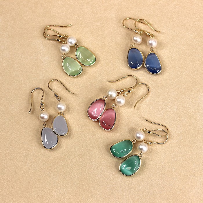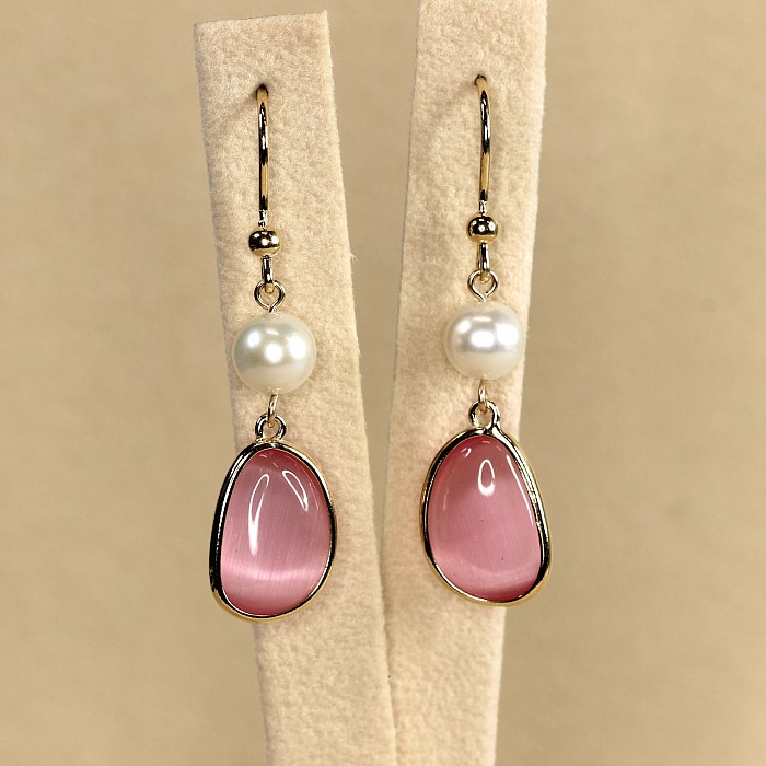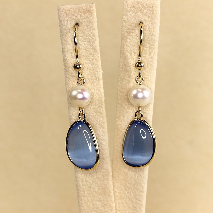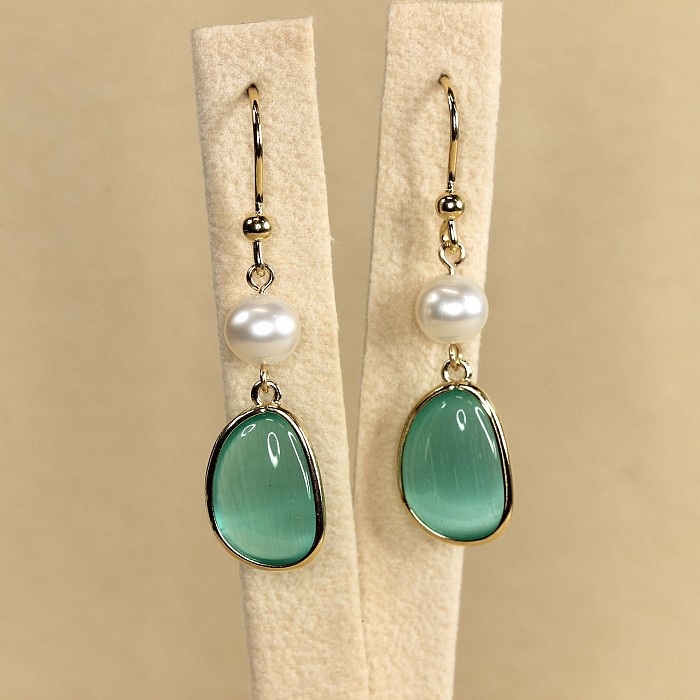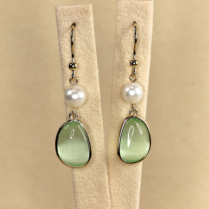 Luxusné závesné náušnice s perlou a elegantným oválnym kameňom predstavujú dokonalú harmóniu jemnosti a modernej elegancie. Hladko brúsený farebný kameň svojim zastreným leskom nenútene dopĺňa jemný lesk bielych perál. Čistý dizajn vytvára dojem tichého luxusu – štýlu, ktorý nepôsobí okázalo, ale napriek tomu zaujme na prvý pohľad.